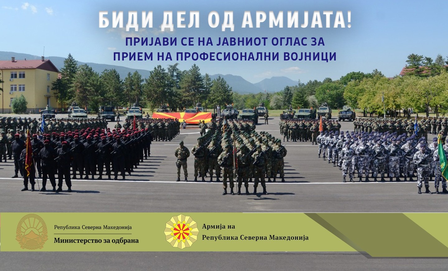 Министерството за одбрана денеска објави оглас за прием на 150 професионални војници на служба во Армијата на Република Северна Македонија. Рокот за пријавување на кандидатите е 15 дена вклучувајќи го и денот на објава. Условите за пријавување на лицата на јавниот оглас се следни: