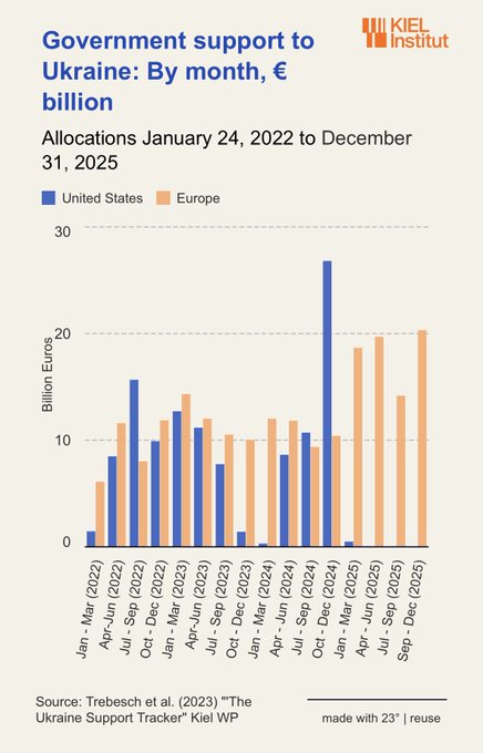 Фактите сепак зборуваат нешто друго. Освен што врши притисок да се ослободи купувањето нафта од Русија со што и обезбедува пари да ја протолжи војната против Укераина, Трамп ја суспендираше целата помош за Украина по неговата инаугурација. Ниту еден цент од САД не оди во Украина, па европските земји практично купуваат американско оружје за да и помогнат на земјата да се брани од Русија.Практично САД профитираат од војната на Русија против украина, а не и помагаат. Табелата подоле ги покажува фактите.