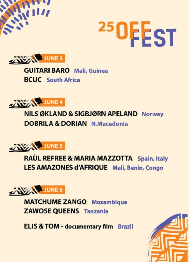 Со престижни учесници од вкупно 15 земји, во најголемиот број африкански. Следејќи ја убавата традиција, во прудружната програма на ОФФест ќе биде прикажан и култниот бразилски документарниот филм „ELIS & TOM“.
