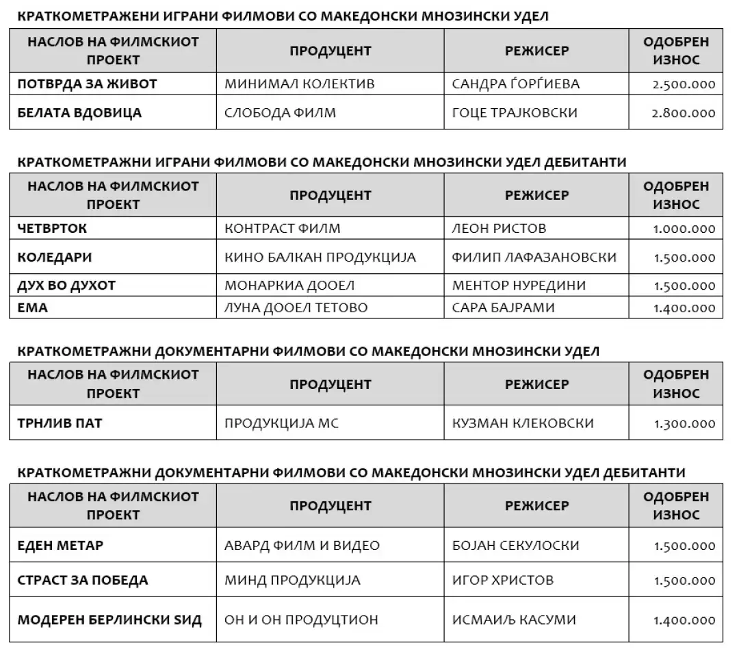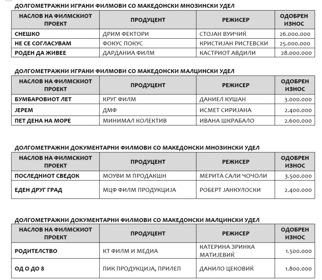 “Овој Конкурс понуди исклучителни проекти и издоминира македонскиот мнозински филм, со фокус на детскиот филм. Ова ќе придонесе најмладата публика да гледа македонски филмови од рана возраст и да ја почитува националната кинематографија„ – изјавија од Агенцијата за филм