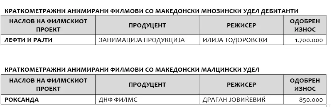 Агенцијата за филм ги објави резултатите од овогодинешниот конкурс за финансирање на проекти за производство на долгометражен и краткометражен игран, документарен и анимиран филм за 2023 во втор рок на одлучување.