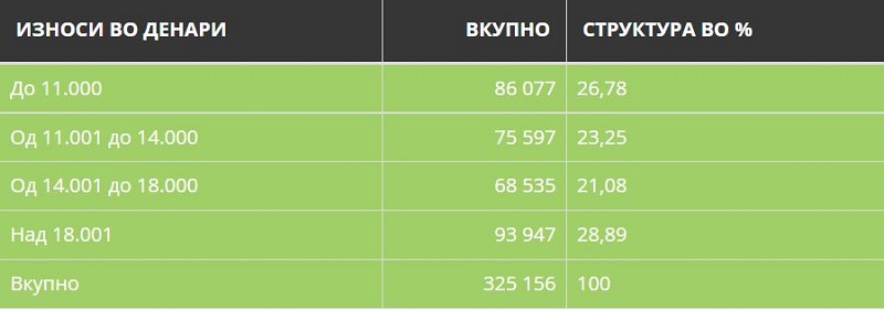 Според податоците на Фондот за пензиско и инвалидско осигурување според состојбата на корисници на пензии по групи, најголем дел од пензионерите земаат пензија над 18.000 денари и до 11.000 денари, односно највисоката и најниската група. Пензионерите со пензии над 18.000 денари во вкупната структура учествуваат со 28,8 проценти (93.947), додека со пензиите што се сметаат под минимална до 11.000 денари нивното учество е 26,7 отсто (87.077) .