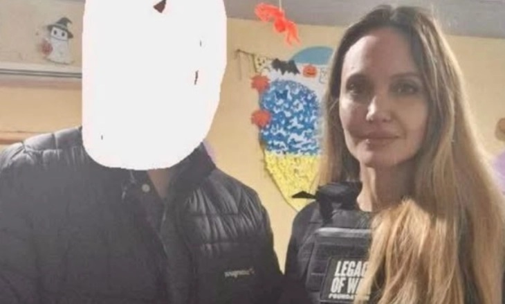 Локалниот функционер, Виталиј Богданов, објави на Фејсбук фотографија од Џоли во панцир со украински ознаки.