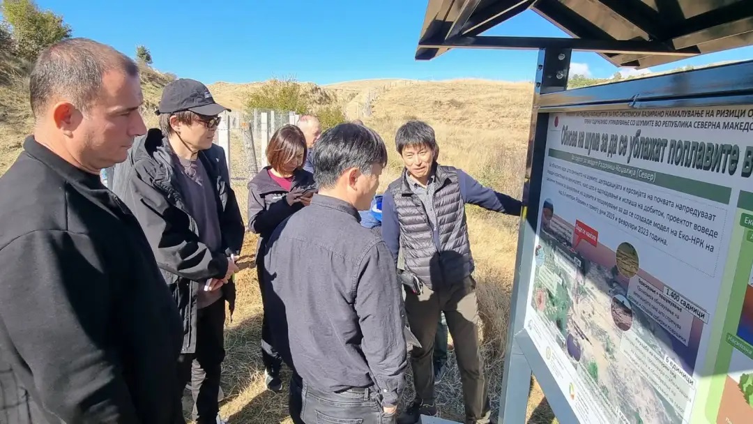 Како што информираа оттаму, посетата е во рамки на завршниот регионален семинар „Проектот за градење на капацитети за екосистемски-базирано намалување на ризици од катастрофи „Eco-DRR“, поддржан од Агенцијата за меѓународна соработка на Јапонија – (ЈИЦА JICA), што се одржува во Скопје и се презентираа сите активности од проектот коишто беа имплементирани и на терен. Практично, се оствари теренска посета на проектната локација на подрачјето на Општина Радовиш, со цел да се согледа практичната примена на „Еко-ДРР“ и конкретните стратешки мерки на терен за намалување на ризикот од катастрофи – во случајот од поројни поплави.