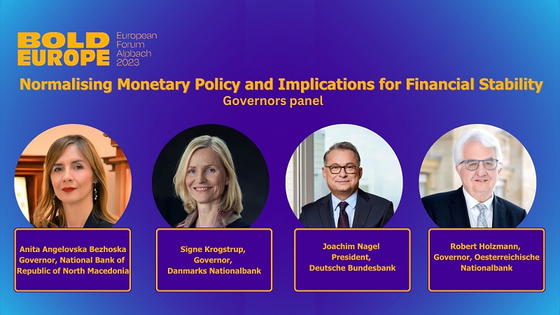 Гувернерката Ангеловска-Бежоска, заедно со гувернерите на Австрија, Германија и Данска, учествуваше на панел-дискусијата „Влијанието на затегнувањето на монетарната политика врз финансиската стабилност“ на Европскиот форум „Смела Европа 2023“ којшто се одржа во Австрија. Во време на подолготрајни инфлациски притисоци, неспорно е дека клучен приоритет на централните банки мора да биде стабилизирањето на инфлацијата, за што е потребна затегната монетарна поставеност. За затегнувањето на монетарната политика да не создава ризици за финансиската стабилност, од клучно значење е да се преземат макро и микропрудентни мерки за одржување и натамошно јакнење на стабилноста на банкарскиот систем. Со преземање мерки на претпазливост, пред да започне монетарното затегнување или во текот на затегнувањето, се јакне капиталниот и ликвидносниот капацитет на банките и се обезбедува поголем простор за централните банки во борбата со инфлацијата.