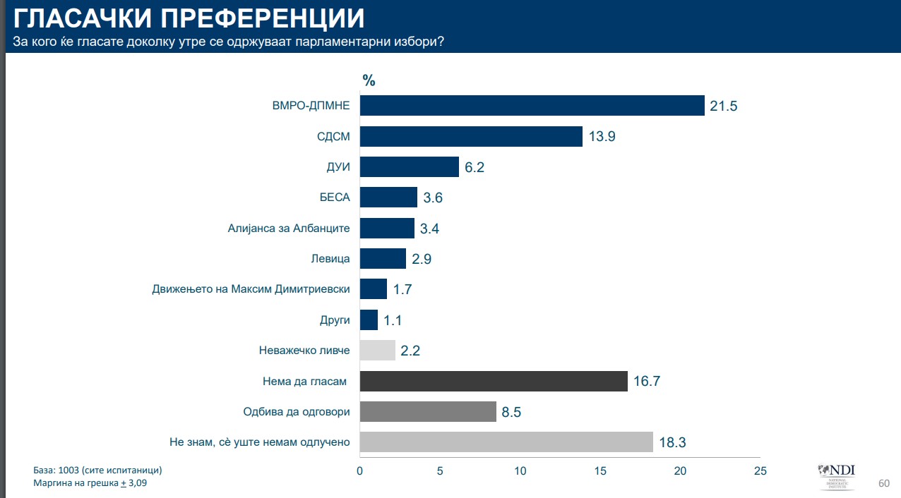 И според последното истражување на Националниот демократски институт ВМРО-ДПМНЕ е во водство пред СДСМ со конфорна разлика. За ВМРО-ДПМНЕ би гласале 21,5 отсто, додека за СДСМ 13,9. Трет на листата е ДУИ со 6,2, па Беса со 3,6, по неа е Алијансата за Албанците со 3,2, Левица со 2,9, Движењето на Максим Димитриевски со 1,7 проценти.