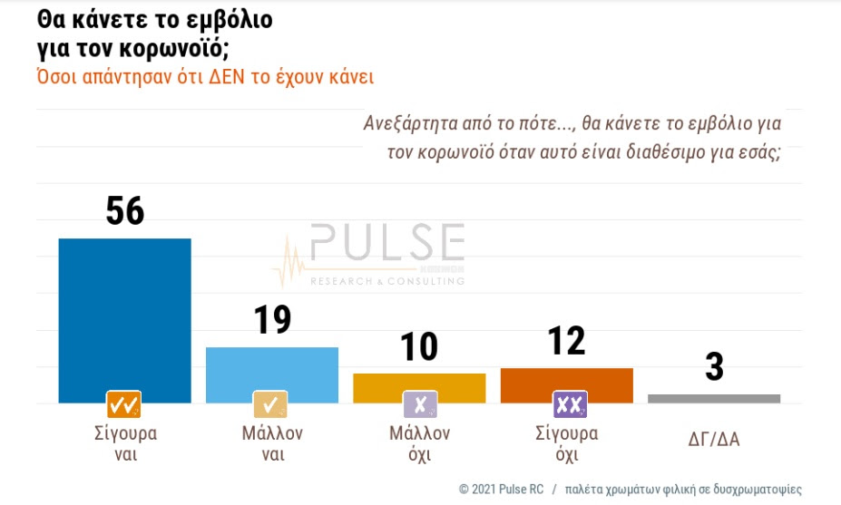 Мнозинството Грци, односно 75 отсто од анкетираните, велат дека сигурно (56 проценти) или веројатно (19 отсто) ќе се вакцинираат, а само 22 проценти одговориле негативно, според истражувањето на јавното мислење спроведено од агенцијата „Pulse“ за грчката телевизија „Скај“, јави дописничката на МИА од Атина.