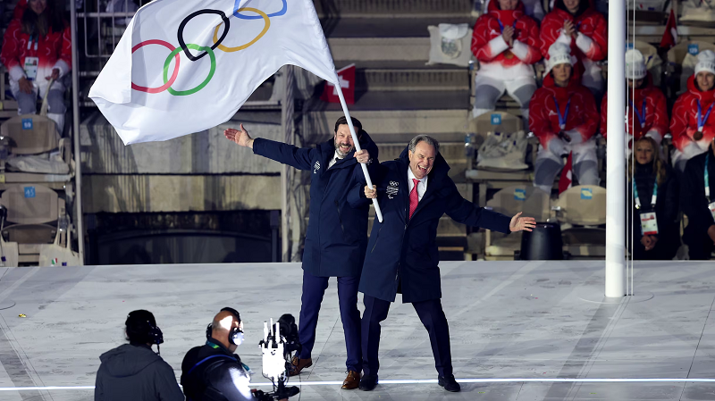 Потоа, во протоколарниот дел од церемонијата, таа го презеде олимпиското знаме од градоначалникот на Милано, Џузепе Сала, и градоначалникот на Кортина д’Ампецо, Џанлука Лоренци, и им го предаде на претседателот на регионот Прованса-Алпи-Азурен Брег, Рено Музелје, и на претседателот на регионот Оверњ-Рона-Алпи, Фабрис Панекуке, како претставници на домаќините на Зимските олимписки игри во 2030 година, кои ќе се одржат во Франција.