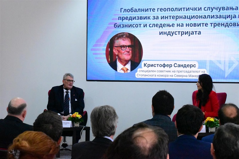 „Како очекувате која било компанија да инвестира овде кога единствената аспирација на луѓето е да се стане членка на ЕУ? Колку луѓе ќе ја напуштат земјата штом тоа ќе се случи? Каде се моите работници во иднина кога тоа ќе се случи? Каде е фокусот во Македонија за развој на вештини, способности, на образовна основа кои ќе помогнат да се надминат и другите земји, да дојдете во прва позиција, да кажете ‘можам да создадам тим во Македонија за да го добијам тоа што треба, денеска, утре, во иднина, да знам дека ќе го добијам тоа и дека преземените обврски ќе бидат исполнети’. Тоа е големиот ризик што го забележувам во моментот“, истакна Сандерс, Британец кој целиот свој работен стаж го поминал во германски „Костал“, а сега е специјален советник на претседателот на Комората, Бранко Азески. тој денеска зборуваше на традиционалното месечно обраќање на актуелна тема, што овој пат беше со наслов „Глобалните геополитички случувања – предизвик за интернационализација на бизнисот и следење на новите трендови во индустријата“.