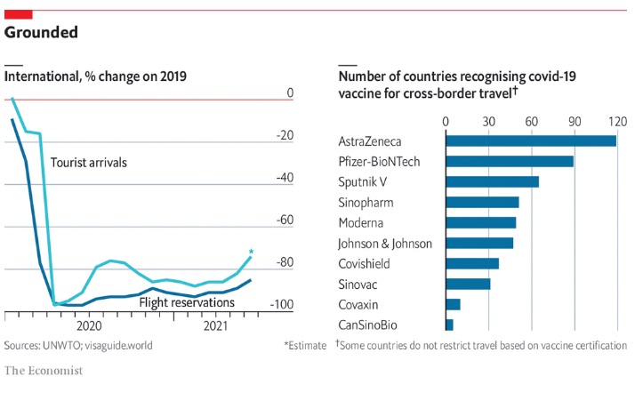Многу влади ги пречекуваат само примателите на одредени вакцини против „Ковид-19“ како посетители. Овој месец Европската унија соопшти дека нема да ги прифати патниците вакцинирани со вакцината „Ковишилд“ – иако е идентична со вакцината „АстраЗенека“ која се користи во ЕУ – затоа што не е одобрена од регулаторот на ЕУ за лекови. Владата на Индија, каде што се произведува вакцината, се закани дека ќе возврати. Политиката може да влијае и на примателите на „Ковишилд“ на друго место во светот: Така, на пример, 5 милиони дози се испорачани во Британија.