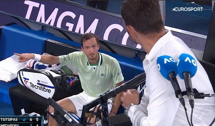 – Погледни ме кога ти зборувам! Неговиот татко кажува за секој поен? Дали си глупав? О Боже. Ти си лош човек. Како можеш да бидеш толку лош во полуфинале на Грен слем, му рече Медведев.