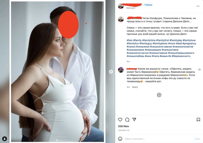„Срамни лаги! Инстаграм профилот на Мариана Подгурскаја покажува – (А) дека таа е од Мариупол и (Б) нејзиниот сопруг објавил фотографија во јануари каде што е видливо бремена“.