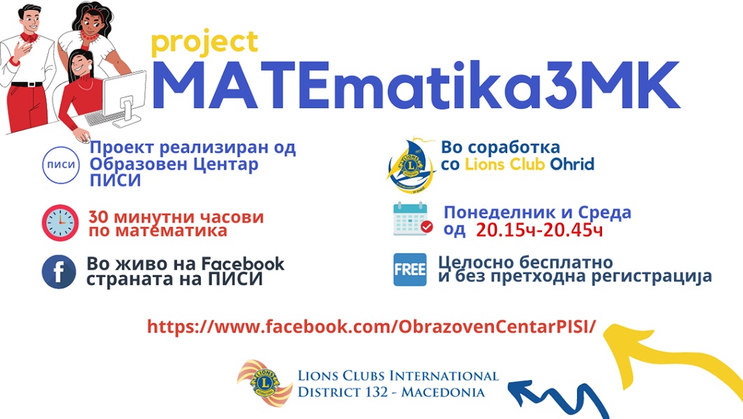 „Лајонс клубот Охрид и образовниот центар ПИСИ, повторно, го спроведуваат проектот „МАТЕматика3МК“ како помош за децата и нивните семејства. Секој понеделник и среда, наставник ќе реализира предавање во времетраење од 30 минути, на која покрај ученикот, може да присуствува и еден родител. Наставата може да се следи преку Фејсбук профилите на еден од родителите“, вели магистер Ангел Јанев од Лајонс клуб Охрид.