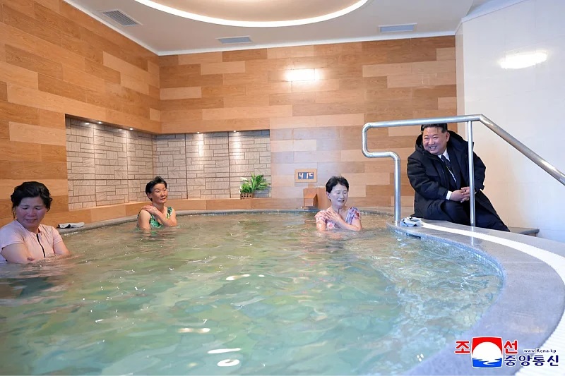 Севернокорејскиот лидер Ким Џонг Ун беше снимен, целосно облечен во неговиот препознатлив тежок зимски капут и со насмевка на лицето, како седи на самиот раб од базен додека жените се релаксираат во термалната вода.