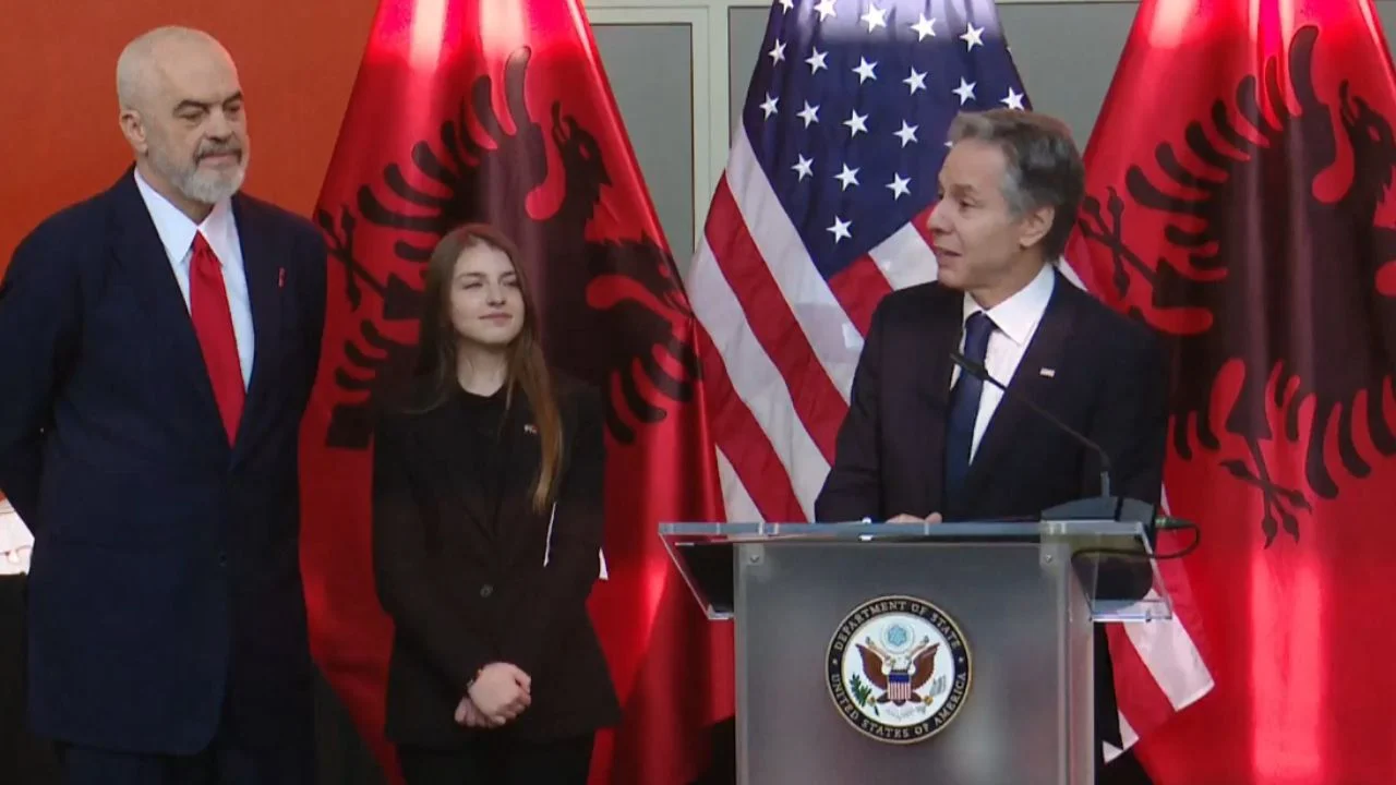 Американскиот државен секретар Ентони Блинкен денес е гостин на албанскиот премиер Еди Рама во Тирана. Пред прес конференцијата Блинкен ги исфали промените во земјата, водството на премиерот и ги спомена сите прославени албанци во моментов – од Дуа Липа до Мира Мурати, која требаше да биде извршен директор на водечката компанија во САД за вештачка интелигенција „Open AI“.