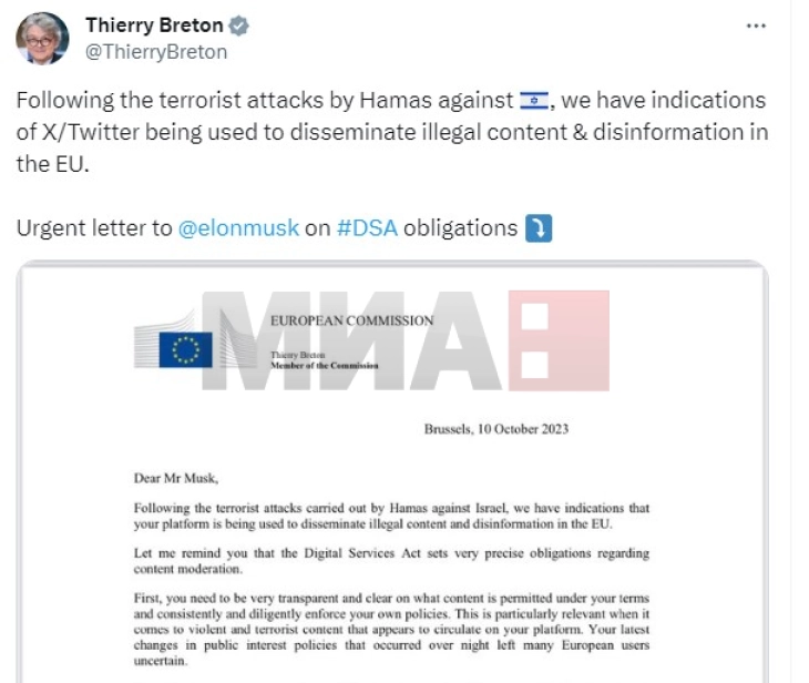 Европскиот комесар за внатрешен пазар, Тиери Бретон го предупреди американскиот милијардер и сопственик на социјалната платформа X (поранешен Твитер) Илон Маск дека платформата е преплавена со дезинформации за војната во Израел, што е спротивно на правната рамка на Европската унија.