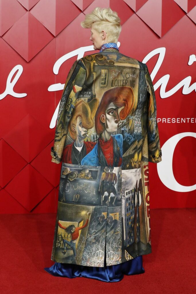 Тилда носеше долг капут со директен крој и остри линии, целосно покриен со надреалистички цртежи во земјени тонови. Строгата тоалета криеше малку понежна креација – небесно сино сатенско макси фустан со широки шик ракави, исто така насликани со слики од ангели и облаци.