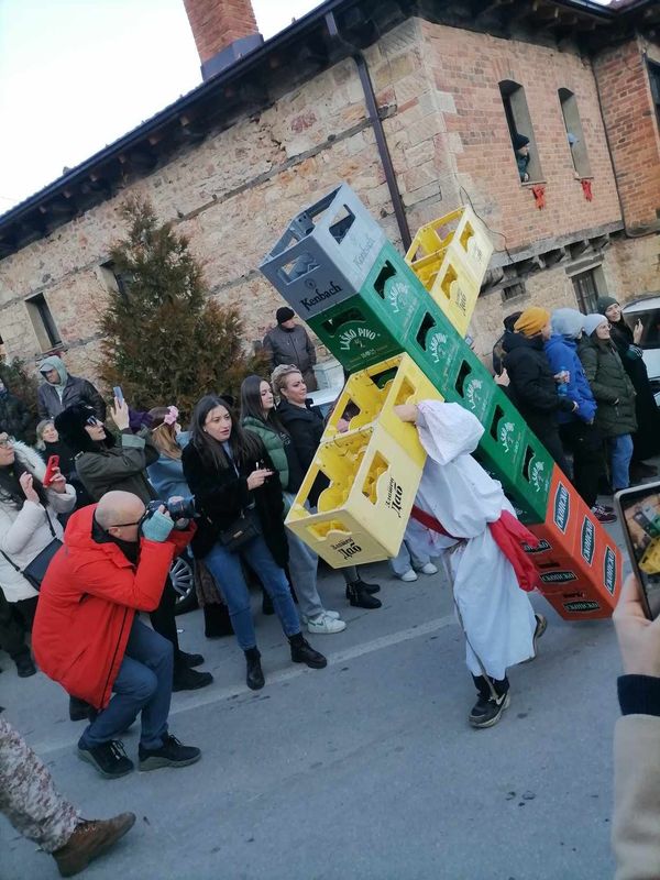 Покрај традиционалните маски како зетот, невестата, ѓаволот, како и секоја година кога актуелните шегите кои секоја година се во фокусот – премиер овде имаше со случувањата во М-НАВ, годинава во Вевчани вниманието го привлече маската според многумина е навредлива: Исус како влече крст од пивски гајби.