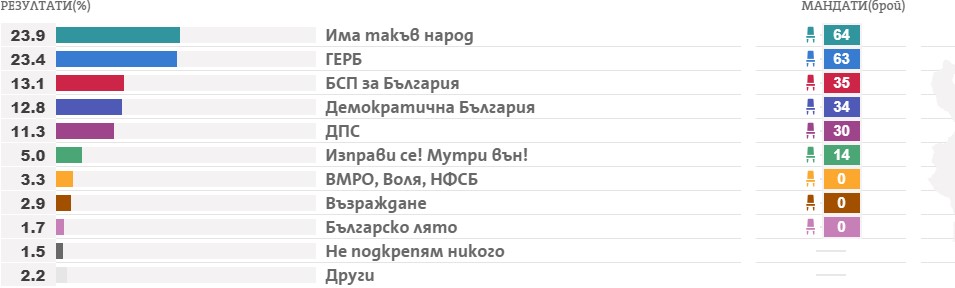 „Има таков народ“ освоија 23,2 процента од гласовите, ГЕРБ-СДС – 23 отсто, БСП – 14,3 проценти, Демократска Бугарија – 13,4 отсто, ДПС – 11,5 проценти, Исправи се! Мутри надвор! – 5,1 процент. Останатите пратии не го преминаа дозволениот праг за влез во парламентот.