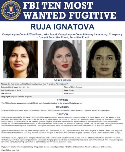 ФБИ тврди дека Игнатова на крајот ги убедила инвеститорите да и дадат милијарди долари, капитализирајќи ја вревата околу криптовалутите, пред да исчезне во 2017 година, откако беше издадена федерална потерница за нејзино апсење.