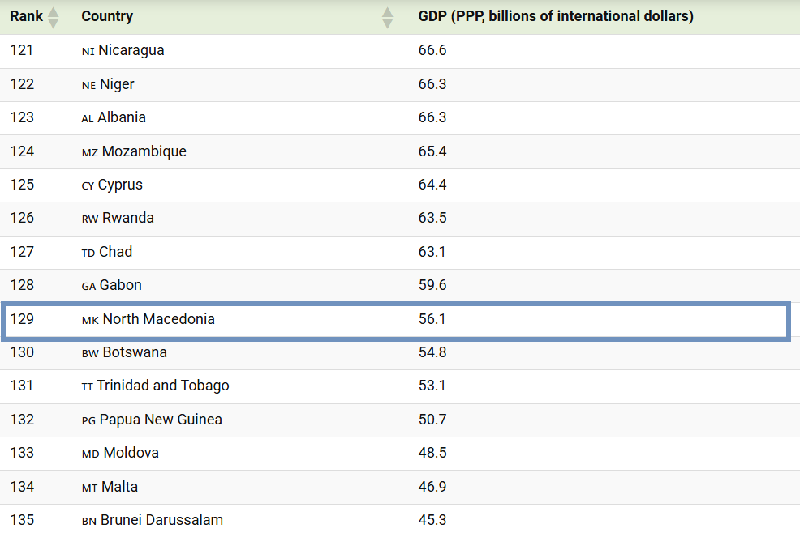 Македонија на 129-тото место меѓу 190 рангирани земји според домашниот производ мерен по паритетот на куповната моќ, покажува табела која што ја објави „Вижуал капиталист“, портал специјализиран за графиќко презентирање на економските состојби.