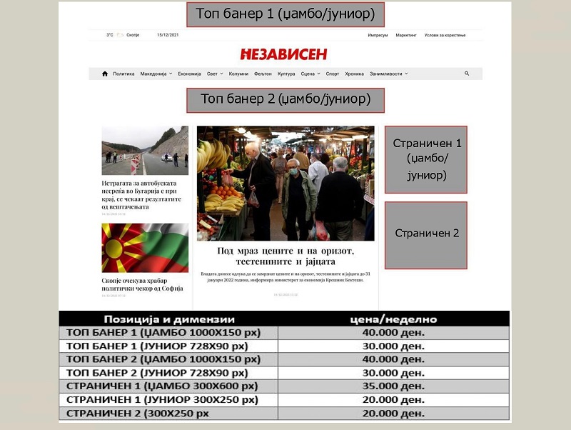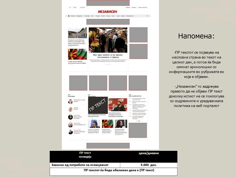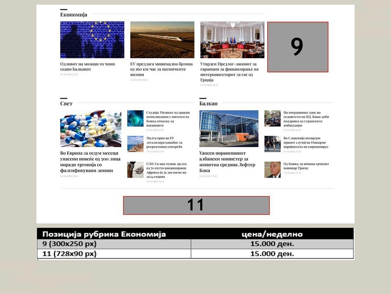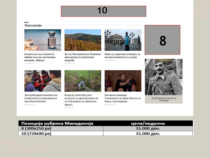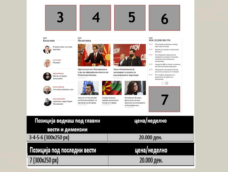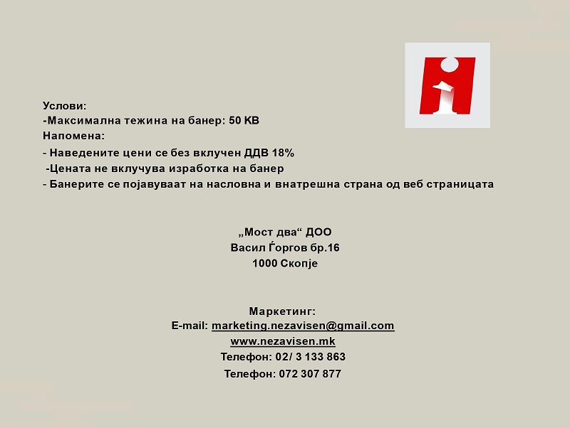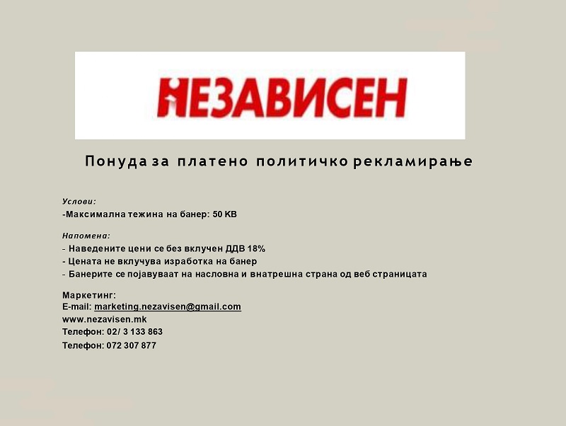 Ценовник за платено политичко рекламирање 06/10/2025 13:14 Поврзани содржини ВМРО-ДПМНЕ предлага пион на олигархијата во Карпош, вели Филипче 06/10/2025 21:10 Мицкоски по изборите ќе правел ресет на системот: „Ќе ја допреме вистината“ 06/10/2025 21:10 ДИК одобри акредитации за меѓународни и домашни организации за набљудување на локалните избори 06/10/2025 17:10 Порака од Апасиев до членството на Левица: „Вмроидниот режим се плаши од борба“ 06/10/2025 14:10 Филипче: Ја одбиваат Резолуцијата, а до збор ги имаат истите барања во програмата 06/10/2025 13:10 Сестри, браќа, братучеди, мајки, татковци и сопружници на советничката листа на ЗНАМ во Струга 06/10/2025 13:10 Ким Мехмети: ВЛЕН се вазали без легитимитет 06/10/2025 13:10 Османи: Секое второ дете во Чаир има проблеми со `рбетниот стилб, а немаат пристап до спортските објекти 06/10/2025 12:10 Најчитани Промена на часовникот 2025: Ова е точниот датум кога започнува зимското време 02/10/2025 09:13 Никогаш не перете алишта на 40 степени, туку само на оваа температура: Ќе бидете благодарни кога ќе чуете зошто 01/10/2025 09:54 Рецептот за лажен ајвар го освои интернетот! Потребно е само половина час за да се направи 01/10/2025 10:40 Мицкоски дозна како се станува патриот 01/10/2025 08:05 Орбан ни се потсмева за укинувањето на ветото: Никако, никако, никако… 01/10/2025 16:06 Четири најсреќни хороскопски знаци во октомври 2025 година: Нови поглавја, важни проекти и моќна енергија 02/10/2025 11:59