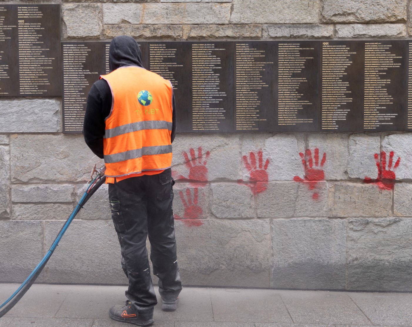 Обвинителството соопшти дека агент за обезбедување фатил две лица како поставуваат шаблони на споменикот.