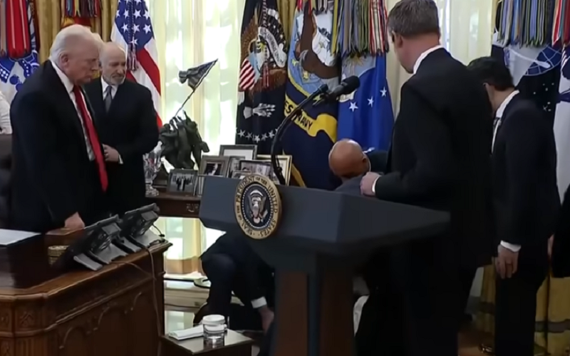За време на настан во Белата куќа посветен на намалување на цената на лековите за дебелина, еден од гостите се онесвести, предизвикувајќи привремен прекин. Човекот, идентификуван како Гордон Финли, претставник на фармацевтска компанија, се сруши додека претседателот Доналд Трамп држеше говор во Овалната соба. На Финли веднаш му беше укажана медицинска помош, а Белата куќа подоцна потврди дека е добро.