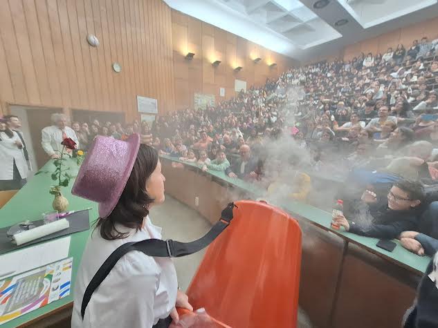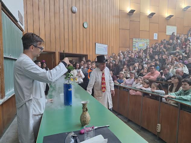 Ова се само некои од хемиските експерименти кои денеска, студенти и нивните професори од Институтот за хемија, Марина Стојанова и Владимир Петрушевски, ги изведоа пред стотици основци и средношколци. Хемиските реакции кои ги предизвикаа хемичарите, направија вистински спектакл во преполниот амфитеатар, пишува Мета.