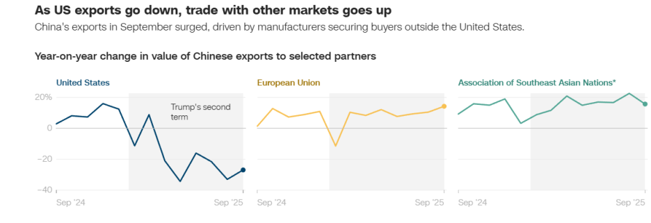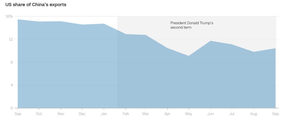 Дури и пред вториот мандат на Трамп, кинескиот извоз во САД опаѓаше. Ова се забрза уште повеќе во последните неколку месеци. Во септември, извозот во САД изнесуваше вкупно 34,3 милијарди долари, во споредба со 47 милијарди долари во истиот месец минатата година – пад од 27 проценти.