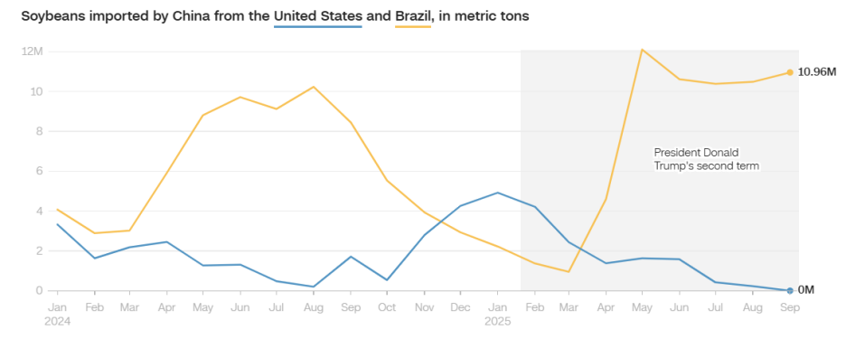 Иако кинескиот увоз на американска соја се намалува во последните неколку месеци, Кина не увезе соја од САД во септември за прв пат по години. Наместо тоа, Кина се сврте кон Бразил и Аргентина, каде што пратките соја во Кина продолжуваат да растат. Во септември, аргентинската влада привремено ги суспендираше даноците за извоз на соја, што ја поттикна кинеската влада да купи околу 1,2 милиони метрички тони од јужноамериканската земја.