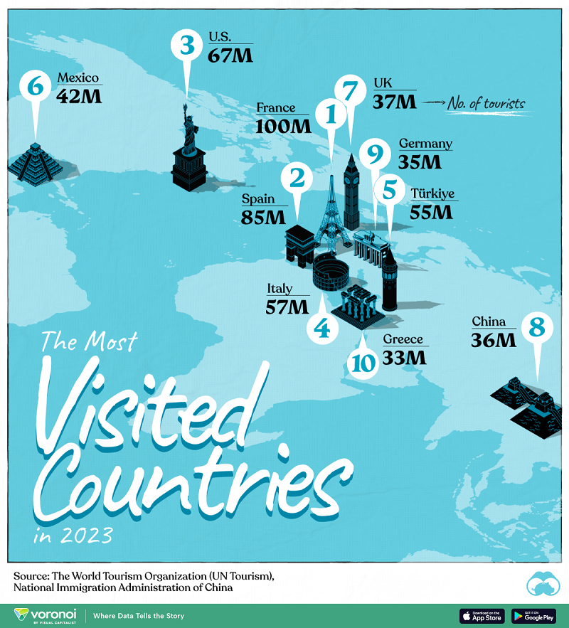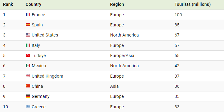 На врвот на листата, Франција минатата година прими 100 милиони посетители. Се очекува земјата да ги повтори резултатите во 2024 година, што ќе биде под влијание на Олимписките игри во Париз во 2024 година во јули и август.