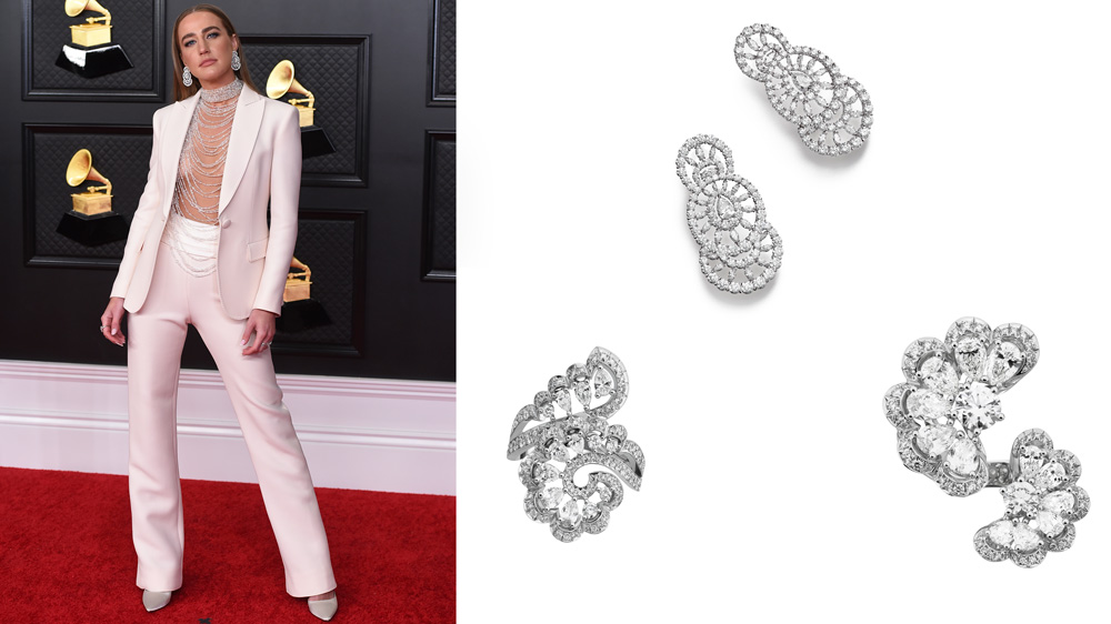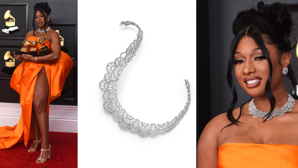 Меган Ти Сталион не само што освои три Греми награди за најдобар нов изведувач, за најдобра рап изведба („Savage“, Megan Thee Stallion со Бијонсе) и за најдобра рап песна (исто така за „Savage“), таа тоалетата на „Долче и Габана“ ја дополни со кралски накит „Шопард“. Дијамантскиот ѓердан од колекцијата „Црвениот тепих“ на брендот,има неверојатни 91,70 карати дијаманти поставени во 18-каратно бело злато и дијамантска нараквица од 83,42 карати, во бело 18-каратно бело злато . Овие две парчиња ги дополни со 33,8 карати дијаманти во облик на круша, поставени во бело 18-каратно злато и дијамантски прстен со крупен брилијантен рез од 3,31 карати, опкружен со 6,47 карати дијаманти, исто така поставено во бело злато од 18 карати. Јасно е дека таа дојде да победи.