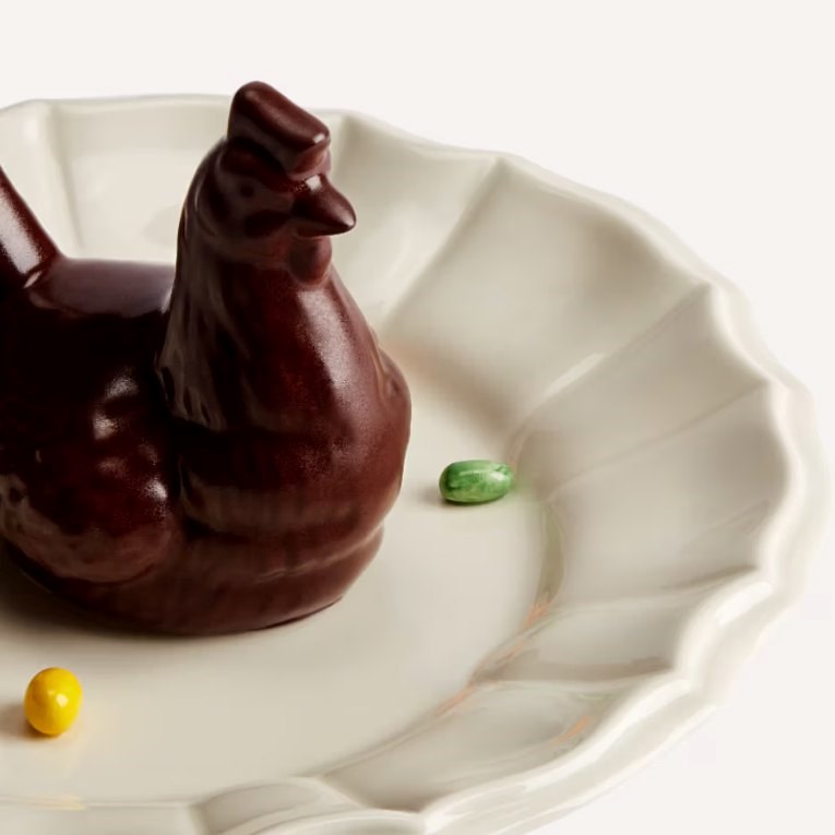За да ја надополни сезонската понуда, Dior Maison претставува и богато изработен керамички декоративен предмет од својата колекција Trompe-l’œil. Уметничкото дело прикажува реалистична кокошка и шарени јајца поставени на елегантни чинии, директна почит кон естетиката на стилот trompe-l’œil од 18 век.