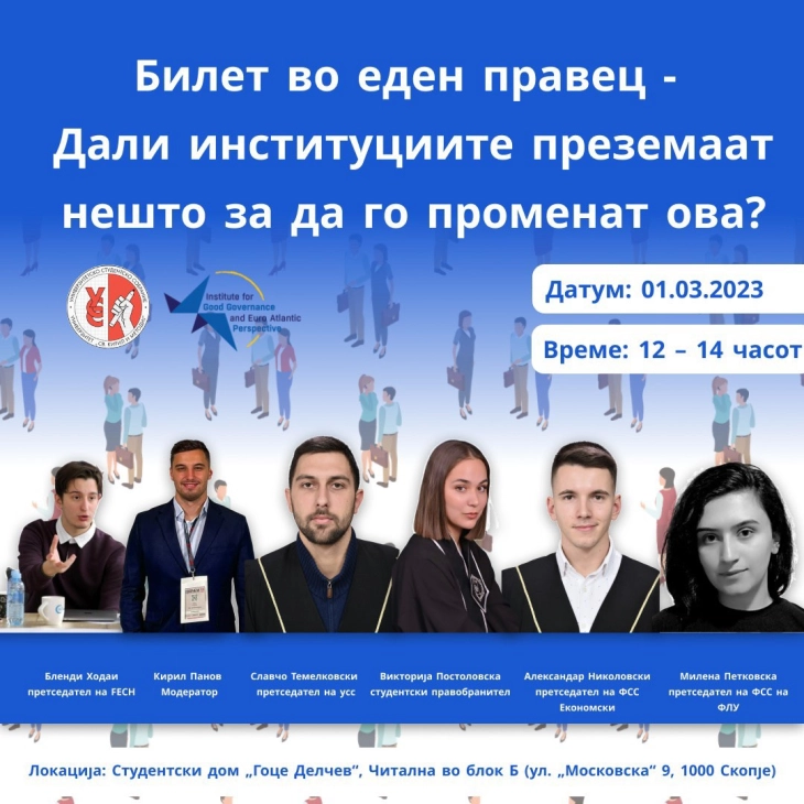 Институтот за добро управување и евроатлантски перспективи (ИДУЕП) во соработка со Универзитетското студентско собрание при Универзитетот „Св. Кирил и Методиј“ (УСС УКИМ), денеска во студентскиот дом „Гоце Делчев“ ќе организираат јавен настан насловен „Билет во еден правец – Дали институциите преземаат нешто за да го променат ова?“.