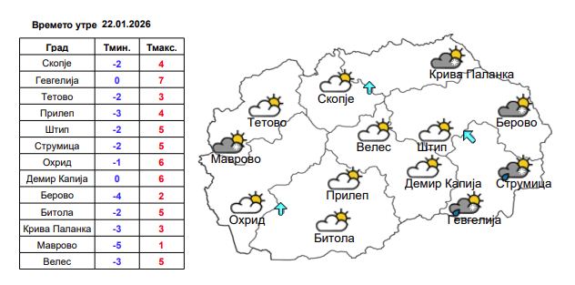 Времето утре: Променливо облачно со сончеви периоди. Претпладне ќе има локални врнежи од дожд и снег, а на повисоките места и на планините од снег. Попладне облачноста ќе се намалува. Ќе дува слаб јужен ветер.