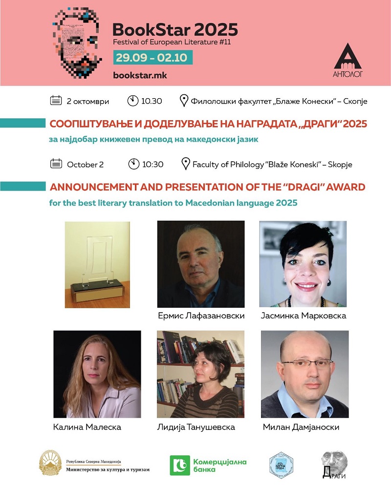 На Филолошкиот факултет „Блаже Конески“ денеска ќе биде соопштена и доделена наградата „Драги 2025“ за најдобар книжевен превод на македонски јазик.