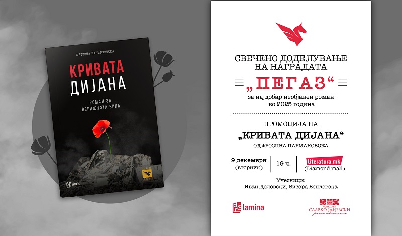 На писателката Фросина Пармаковска вечер свечено ќе и биде доделена наградата „Пегаз“ за 2025 година, за нејзиниот роман „Кривата Дијана“ кој победи на конкурсот организиран од издавачката куќа „Арс Ламина“.