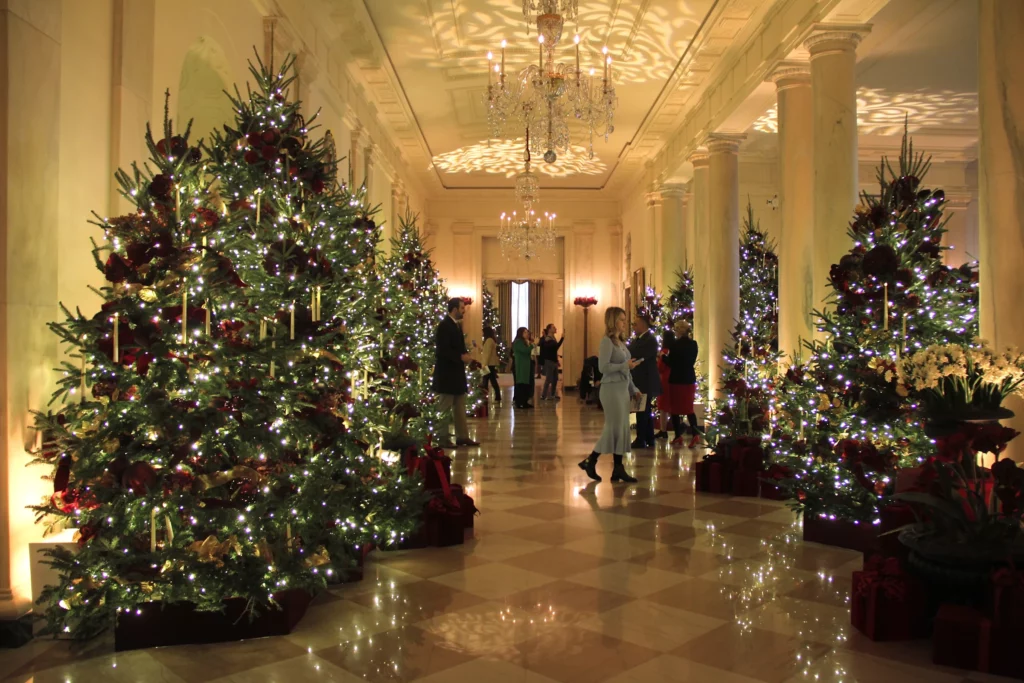Просторите имаат шума од 28 дрвја во бордо и златна боја, украсени со зеленило, ленти, украси и конусни свеќи. Садниците се полни со амарилис, за кој Белата куќа рече дека претставува сила и љубов – особено околу празниците.