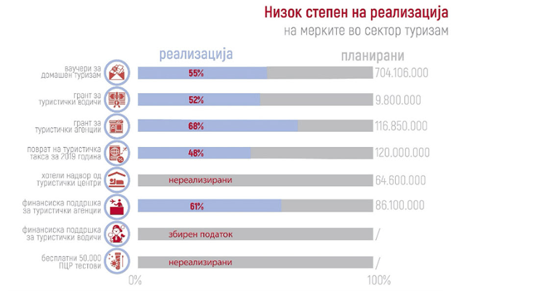 Реализацијата на мерката „ваучери за домашен туризам“, како што се истакнува, е 55 отсто од планираните 704.106.000 денари, мерката „грант за туристички водичи“ е реализирана со 52 отсто од планираните 9.800.000 денари, мерката „грант за туристички агенции“ е реализира со 68 отсто од планираните 116.850.000 денари, повратот за туристичка такса за 2019 година е 48 отсто од планираните 120.000.000 денари, целосно е нереализиран проектот „хотели надвор од туристичките центри“ во вредност од 64.600.000 денари, а мерката „финансиска помош за туристички агенции“ е реализира со 61 отсто од планираните 86.100.000 денари.