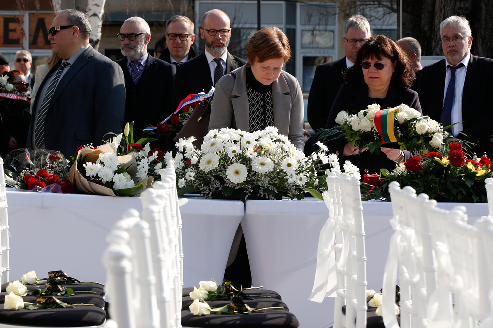 Шеесет и трите бели столчиња се наредени на отворено, а на нив е ставена по една бела роза за спомен.