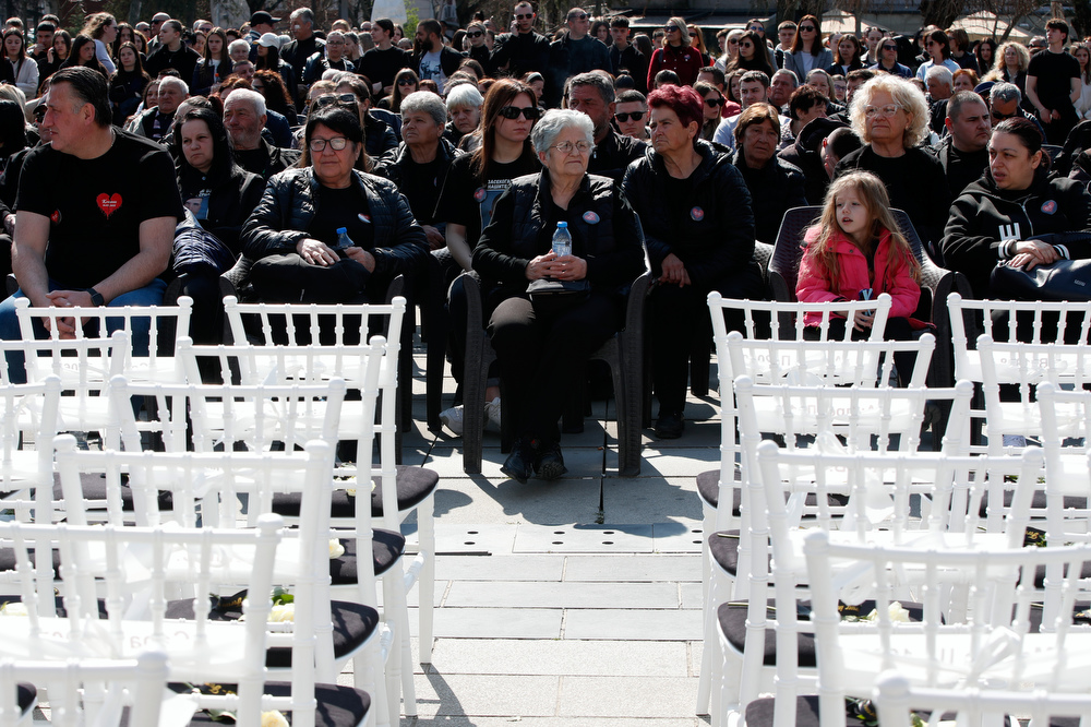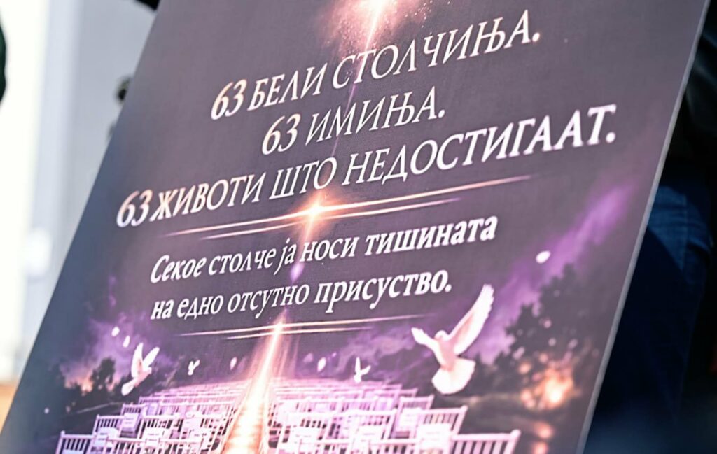 „63 бели столчиња, 63 имиња, 63 животи што недостигаат – секое столче ја носи тишината на едно отсутно присуство, бела роза за спомен, светлина за сеќавање и место што никогаш нема да биде исполнето“,е пораката со која семејствата на загинатите ги пречекаа присутните пред Домот на културата во Кочани.