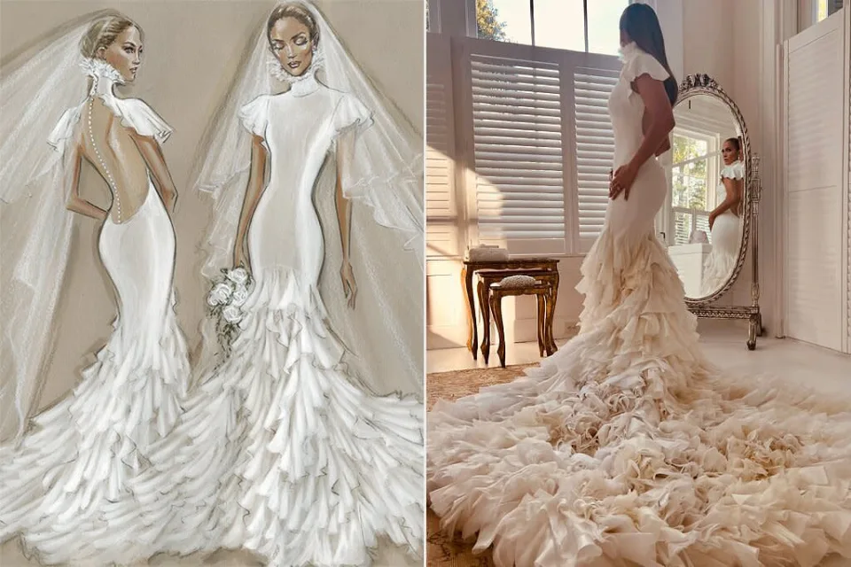Нејзините екстравагантни три невестински изгледи го украдоа вниманието додека таа и оскаровецот си разменуваа завети. За церемонијата, таа носеше прилагоден дизајн од колекцијата на Ралф Лорен. Според Vogue, повеќе од 500 метри ткаенина биле исечени во слоеви на дијафанозни бразди, кои каскадирале по разгорениот воз на силуетата .