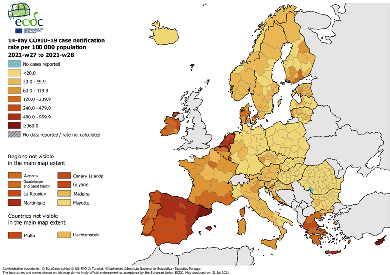 Според последните промени, Франција и Грција ќе вклучат речиси целосно портокалов аларм поради ширењето на Ковид-19. Неколку региони во Италија исто така се менуваат од зелена во портокалова боја на мапата на ЕЦДЦ.