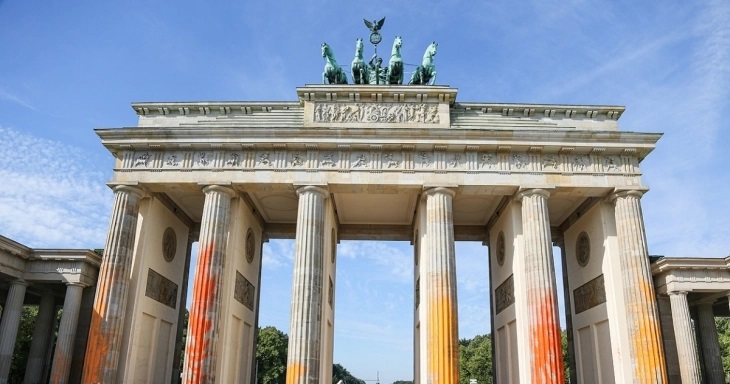 Членови на еколошкото движење „Последна генерација“ денеска ја испрскаа Бранденбуршката порта, симбол на Берлин, со портокалова боја.