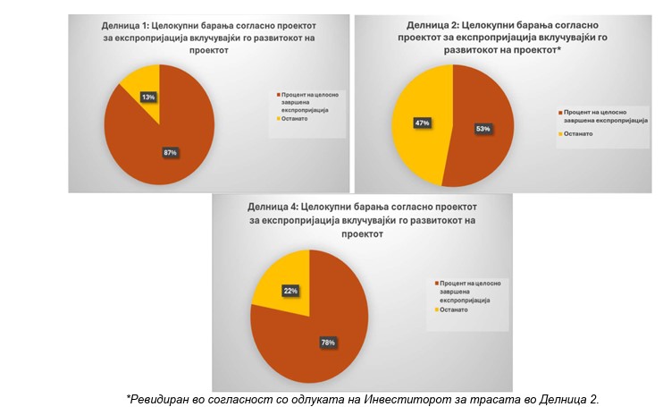 „Проектот за експропријација се подготвува како дел од Урбанистичкиот проект за објекти од стратешки интерес. Проектот за експропријација е одговорност на Инвеститорот, за што се ангажирани специјализирани изведувачи“, се вели во извештајот, при што се наведува и дека вкупниот опфат на проектот за експропријација е зголемен, односно дека „заедно со процесите на развој на проектирањето, во проекти за експропријација се појавија дополнителни барања“.