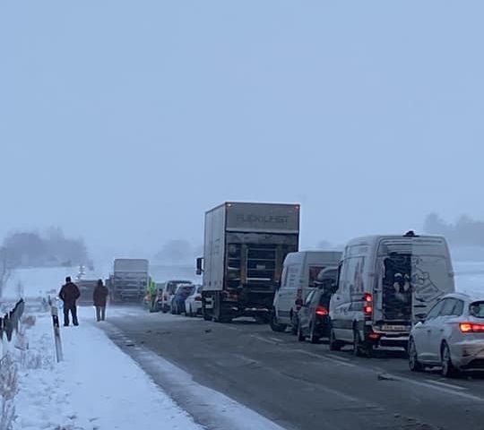 Патот Е22 меѓу Хорби и Кристијанштад се очекува повторно да биде отворен до утре наутро. „Патот е долг, околу 5 километри“, соопшти спасувачката служба во Кристијанштад. „Автомобилите и камионите мора да се отстранат и патот да се исчисти од снегот пред да се отвори за сообраќај“, додаваат тие.