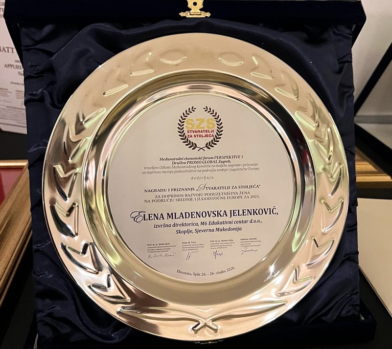 На овој престижен настан, Елена Младеновска Јеленковиќ, извршна директорка на М6 Едукативен центар, беше наградена со меѓународното признание „Stvaratelji za stoljeća“, за нејзиниот исклучителен придонес во развојот на женското претприемништво во Централна и Југоисточна Европа за 2025 година.