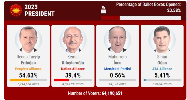 Според податоците, според 23,58 отсто од пребројатните гласови, Ердоган освоил 54,63 отсто, а неговиот главен кривал, Кемал Киличдароглу 39,4 проценти. Во гласови тоа 6,2 милиони наспроти 4,6 милиони.