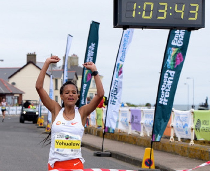 Етиопјанката Јалемзерф Јехуалав денеска во северноирскиот град Ларне го собори светскиот рекорд во полумаратон со време од 1:03:43 со што стана првата жена во историјата која ја истрча полумаратонската патека за помалку од 64 минути.
